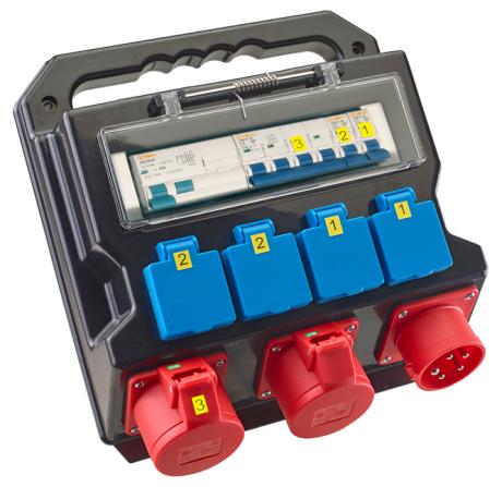 Byggestrømstavle 32A nTilgang: 1 X 32A 5P 400V CEE indtagnAfgang: 1 X 32A 5P 400V CEE og 1 X 16A 5P 400V CEEn4 X 16A 230V med dansk jord.nAlle stikkontakter er beskyttet med automatsikringer og nHPFI relæ. nIP44